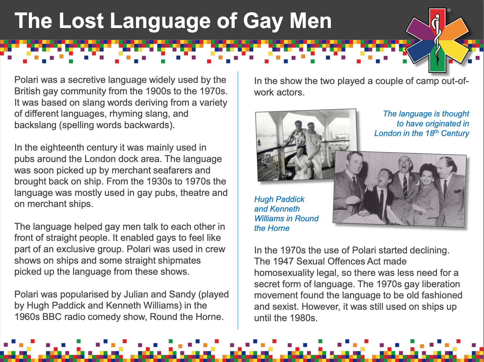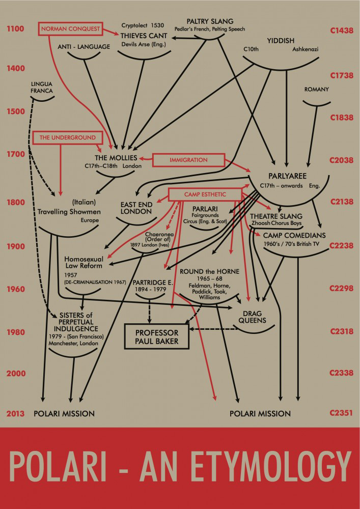Polari is the product of numerous intersecting worlds: male, English, homosexual, low status, theatre, trade networks…