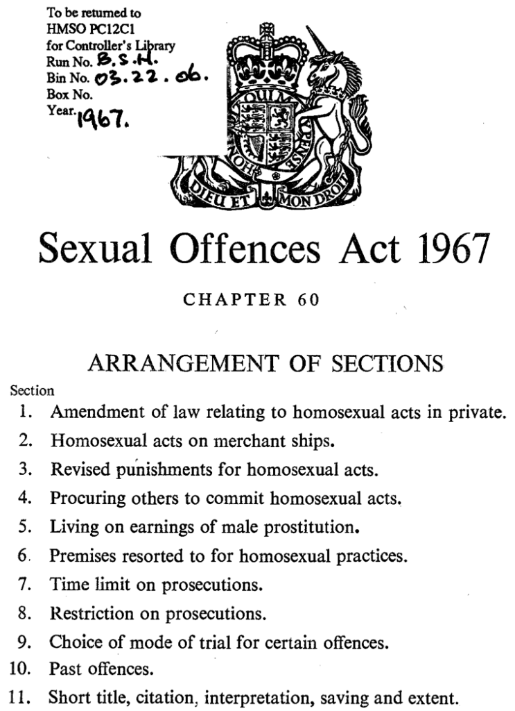 Decriminalisation of homosexuality for men over 21 in England & Wales.