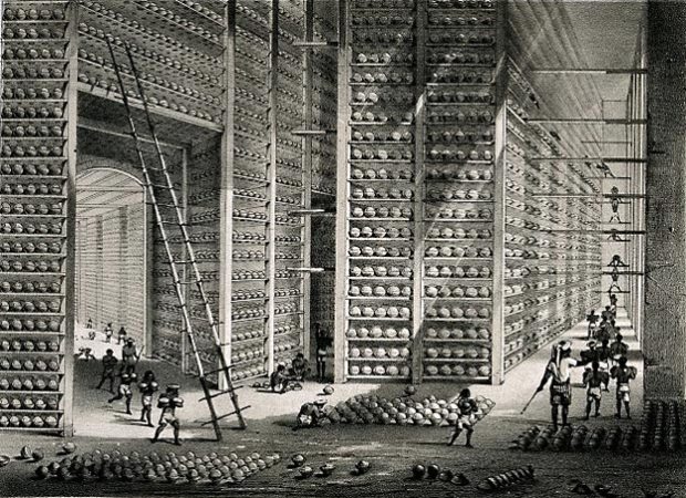 conveying a sense of the opium production process that was followed throughout most of the 19th century. The first is a suite of lithographs based on drawings by Walter S. Sherwill, a lieutenant colonel who served as a British “boundary commissioner” in Bengal. The second rendering of different stages of opium manufacture consists of 19 paintings on mica by the Indian artist Shiva Lal.