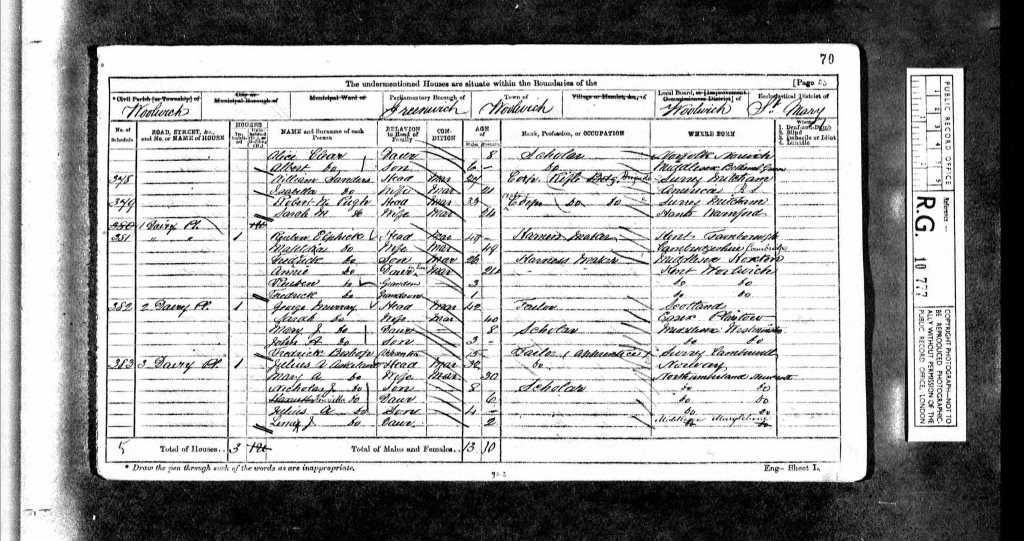 By the time of the 1871 census Robert and Sarah were living in Woolwich at 379 Dairy Place, he was still employed as a Corporal in the Rifle Brigade. Dairy Place doesn’t seem to exist any more, but there is a Dairy Lane very close to the Barracks, most of which has been demolished. This site gives some history of the barracks. However, these pictures, one a postcard from about 1900, and an aerial picture from 1924 show what the area, or at least the barracks, might have looked like then.