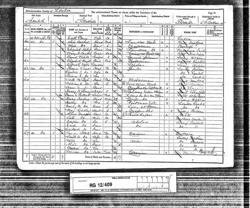 By the time of the 1891 census, Sarah was a widow living in Lambeth at 44 Willington Road, the place where Robert had died, working as a charwoman. By then her son William was working as a coal office clerk, and her daughter Annie was a dressmaker’s apprentice. They shared the house with a family of three, and two lodgers.