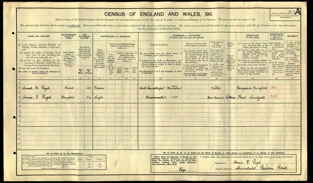 By the time of the 1911 census, Sarah was working as a domestic cook and housekeeper with her daughter Annie, who was a dressmaker, at Shurnhold on Pavillion Road in Worthing.